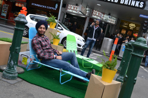 Around 50 people also attended a Masterclass on Tactical Urbanism and Better Blocks the day before the conference. This event was superbly led by Co-Design Studio, supported by Jason Roberts, and included on-site activities on Elizabeth Street in the city. A temporary micro park (pictured) was established between the Elizabeth Street tram terminus and the intersection with Flinders Street.