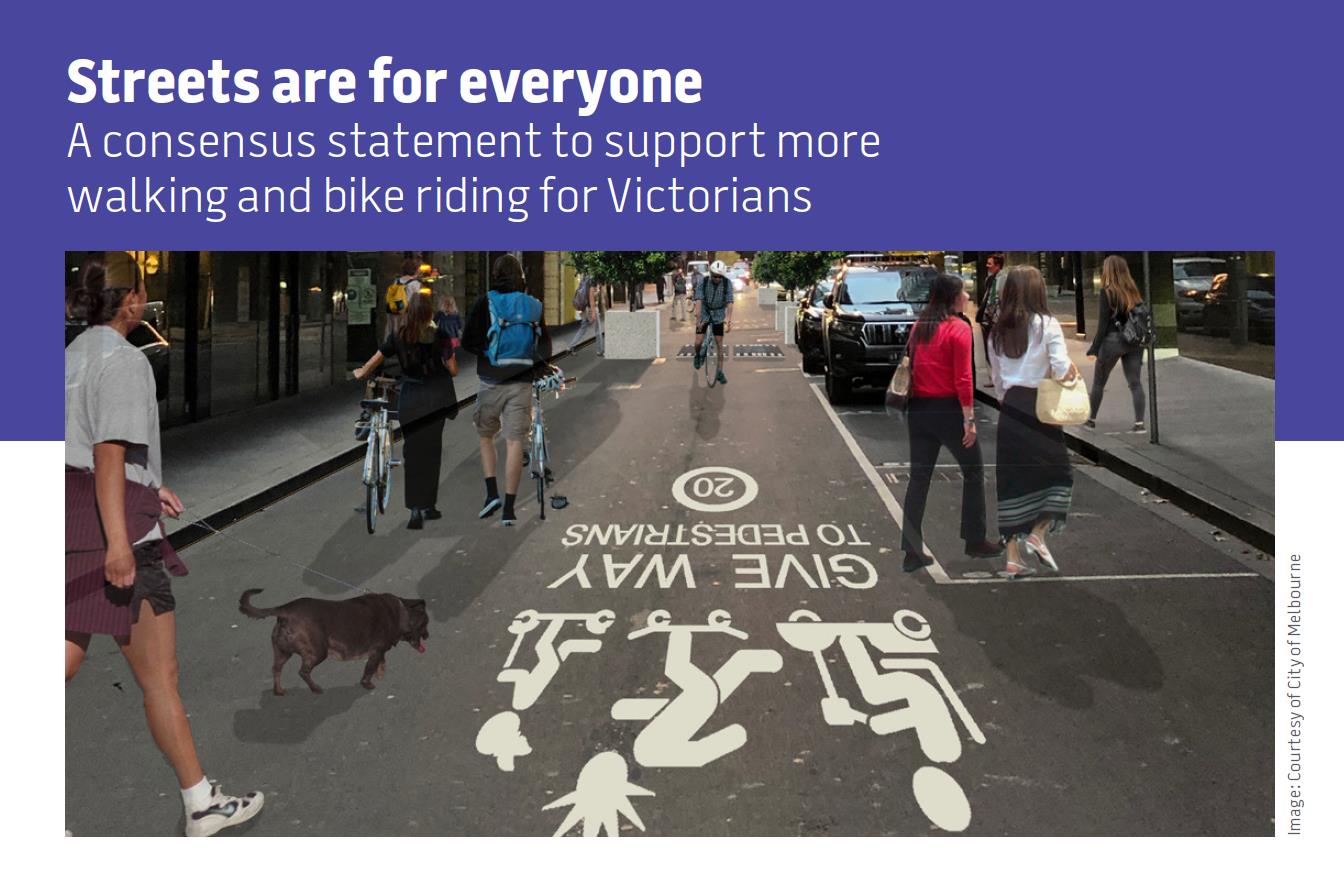 The Streets are for everyone consensus statement, has the support of key advocacy, health promotion and research groups operating in Victoria. It outlines the benefits of walking and bike riding to the economy and the health and wellbeing of Victorians; highlights barriers to the vision; and provides detail on three clear and practical recommendations for implementation by the Victorian Government.